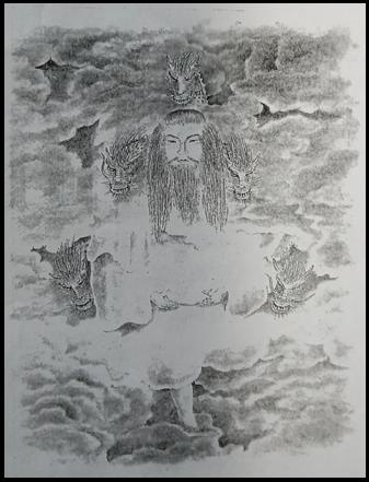 □神仏には、本来、姿かたちはありませんが、ときに人間的な姿をもって出現されることがございます。なお霊主が抱えておられるのは地球です。 描いた人 大先達 樋川宰教
